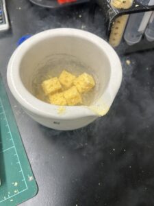 Then comes the fun part: I put the smaller sponge pieces in a mortar and pestle and used liquid nitrogen to make the sponge brittle/fragile, so it would be easier to crush up into smaller pieces (I had to take a few breaks while doing this, as the liquid nitrogen makes the mortar and pestle so cold that it can cause ice burns).