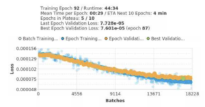 As noted in my previous blogs, the key outcome measures that I’m using in this project include the time spent at the reward area, time spent at the digital touchscreen, and the time spent in differentiated behaviors. When I initially ran some of the Hierarchical Data Format 5 files (HDF5 files) on Google Colab, where we use Python for analysis, I noticed that the time spent at the digital touchscreen was fairly inaccurate as I was extracting points that averaged less than 5 seconds. Upon checking each video of the recorded mouse behavior, it was evident that I should have been generating data points that were far above that value as the mouse spent much more time interacting with the touchscreen. To rectify this issue, I began relabeling frames with the mouse at the digital touchscreen as the model likely wasn’t correctly identifying the nose1 node throughout those frames. I relabeled just under 300 new frames on our deep-learning software, SLEAP, for a total of 1,175 labeled frames. Once that was complete, I began retraining the model, which we’ll now call our n=1175 model. Below is the training graph for the n=1175 model.