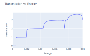 The first picture is the transmission vs. energy graph, where different energy levels produce stepwise transmissions that show conductance quantization. One interesting aspect shows up on the final step, where there is a dip. Mr. Speyer told me that these types of points are what we should be looking out for, where very interesting behavior occurs out of slight changes to geometry.