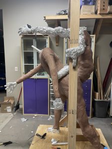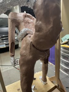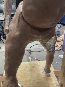 After I ran out of clay for the second time I started to work on other things, like the black thing around Anthony’s waist (by the way I did name my sculpture, the human part is Anthony and the monster part is Derek. This will be a common theme that you will see). I started to cut out parts of the leg and arms to get ready for the mouths! Whoo!