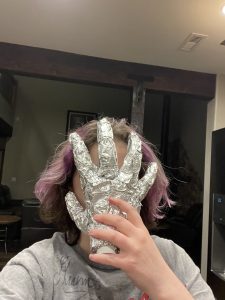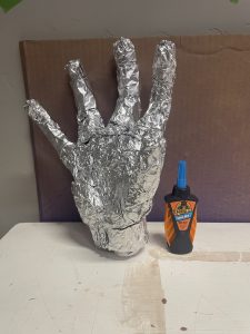 I then started to make all of the hands that I will need. I’m not even kidding, I need so many. I think the total was 8 hands and 1 ✨tiny hand✨ (I can’t help but put sparkles). I took a PVC pipe and hot glued wire to it then shaped the wire and added on tin foil till I got my desired handy shape. I swear the tin foil keeps coming back to haunt me. You really have to trust the process with these, that’s what I kept telling myself and I think it worked.