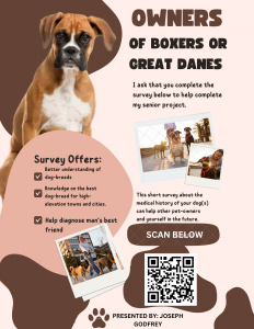 Hi everyone! My name is Joseph G, and I’m a senior at BASIS Flagstaff. My project will examine how elevation affects common cardiomyopathy in Boxers and Great Danes. I chose this project because I’ve always loved animals, having grown up with dogs, cats, horses, goats, and even geese for a bit. My childhood with animals has inspired me to want to be a veterinarian. Therefore, I have chosen to do my senior project on this subject and an internship with a veterinarian in Flagstaff.