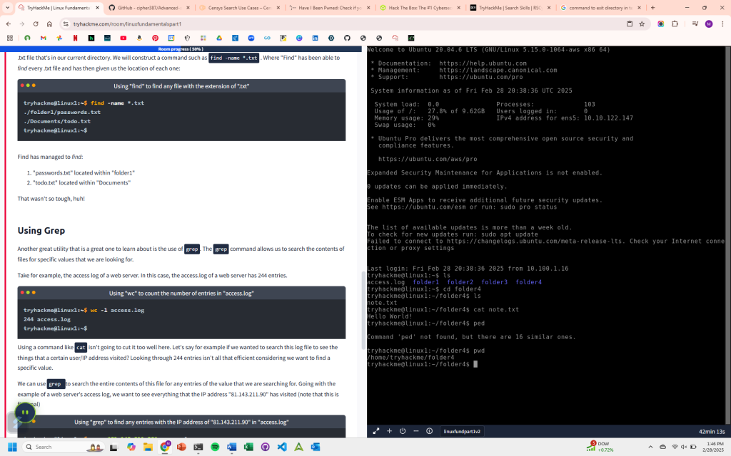 This week, I have continued my Cybersecurity 101 course, completing beginner hacker simulations and deepening my knowledge of how to use Linux, a computer operating system.