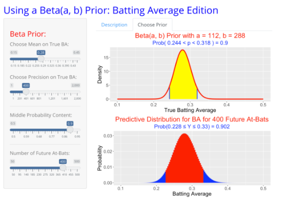 where η is our approximated prior mean and K is an approximation based on our level of confidence in our previous metrics. We can approximate η to approximately .280, since that was how Lindor performed prior to the 2020 season and through some experimentation, we find that K at 400 is a reasonable estimate given the number of at-bats he had to this point. Using these values, we find a is 112 and b is 288. With these, we can create a distribution that gives us both a prior beta distribution and a predictive posterior distribution that we can adjust based on the length of time we wish to use our data to predict.