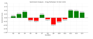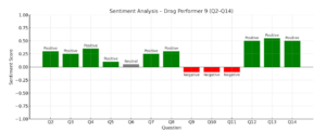 Similarly, Drag Performer 9 felt the same way about the last 3 questions and represented questions 9-11 to have the most negative sentiment. Which if you remember was similar to Drag Performer 2 as well.