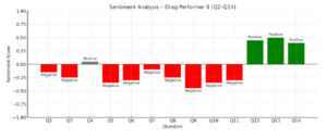 Overall, another point to mention is that most performers expressed strong frustration or sadness (sentiments around -0.10 to -0.30) when it came to concerns about sexualization of youth in drag story hour with the most prevalent themes being ‘mischaracterization’ and ‘colonization’ of the drag community. And overall there was highly negative sentiment (especially Q9) from trans performers and their allies (e.x., Performer 8: -0.45, Performer 10: -0.45) which also plays into that bias aspect we talked about in previous blog posts.