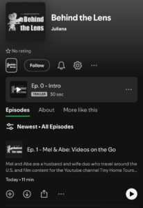 Over the weekend, I released the first episode of my podcast! The podcast is called Behind the Lens and it is on Spotify. I released the 30-second intro clip as a trailer and the Mel and Abe interview as a full episode. I also curated the cover art for the podcast in Google Slides.