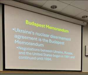 Lastly, he described the current Russian violation of international law as “the fox being put in charge of the chicken house.” After the USSR collapsed, Ukraine possessed the third-largest nuclear arsenal. Because major powers were concerned about the large stockpile in a “new” nation, Ukraine, Russia, the United Kingdom, and the U.S. entered a series of disarmament negotiations from 1991-1994. The most notable of these agreements is the Budapest Memorandum, which guaranteed Ukraine financial support and guaranteed security from Russia, the U.S., and the UK so long as they gave up their nuclear weapons to Russia. As we know, this treaty has since been violated by the Russian invasion, highlighting the alarming possibility of Ukraine obtaining nuclear capabilities because Russia violated their half of the agreement, creating a green light for Ukraine to do the same.