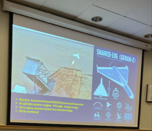 Then, he addressed a recent and effective threat against Ukrainian troops – the deployment of Iranian Shahed 136 kamikaze UAVs (unmanned aerial vehicles) by Russia. He emphasized the tactical capabilities of the Shahed as well as the efficient supply chain of the cheap offensive drones. The Shahed is produced in both Russia and Iran, but recent Ukrainian air strikes have been made on alleged Russian manufacturing facilities.