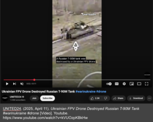 This image was also retrieved from a Russian source, who posted images of the new UAV. It appears to mimic the Russian Lancet UAV but also appears to have new air-to-air interception technology. These images can be sent to Ukrainian UAV regiments to watch out for these new devices on radar to avoid air-to-air collisions. - Ukrainian UAV Strikes an Abandoned Russian Tank