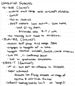 After the meeting, I began my dive into tactical intelligence (TACINT). In the last few weeks, I’ve been conducting strategic intelligence by looking at the larger picture and narrative. TACINT instead focuses on actionable data that can be directly given to troops and be used on the mission level. For example, TACINT would involve giving troops information on a nearby Russian battalion’s personnel count, weapons capabilities, morale, and position.