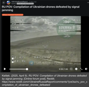 This post shows a series of videos of Ukrainian FPV (first-person view) UAVs losing connection (AXLOSS) from their Ukrainian operator and reconnecting to a Russian operator at certain coordinates and altitudes. These videos were posted by Russian electronic warfare (EW) specialists on Telegram and discovered by OSINT analysts. As Ukrainian advanced drone technology typically outpaces Soviet-era anti-air defense systems, EW has been the most effective Russian countermeasure to Ukrainian UAVs. Using this OSINT information, Ukrainian UAV operators can change their mission strategy to avoid areas where EW is prevalent, reduce radio power, or employ different counter-jamming signals.Reddit u/Keitiek Post: Ukrainian Drones Downed by Russian EW - New Russian UAV