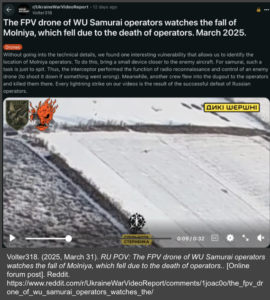 Russia’s new Molniya-2 drone has been deemed the AK-47 of UAVs because of its effectiveness and reliability in combat. However, through OSINT analysis, UAV experts can detect new ways to combat the drone. In this case, bringing a small radio device near the drone will allow troops to locate the operator and strike. This information can be disseminated to UAV regiments when they encounter a Molniya-2.Reddit u/Volter318 Post: Ukraine Takes Down Russian Molniya-2 UAV