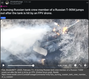 - Keeping Casualty Count: In a war of attrition, it’s critical to know the numbers of enemy stockpiles to ration out resources. OSINT analysts have assisted the Ukrainian government by keeping up with satellite and social media data, allowing troops to focus on defense and not have to rely on falsified Russian reports. Several projects exist to track Russian casualties, such as Oryx and UkrWarSpotting, which both use images to keep databases of Russian equipment losses. An example of their process may look like this. A Reddit user published a video of a T-90M catching fire due to a drone strike.