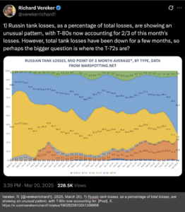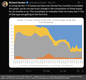 @verekerrichard1 X Post: Russian Tank Losses Per Month @verekerrichard1 X Post: Percentage of T-72 Casualties In this example, an OSINT analyst has tracked Russian tank losses by tank model per month since the beginning of the invasion until March 2025. The data show a drastic decrease in the amount of T-72 casualties in recent months, so some might assume the tank’s assaults are becoming more effective. However, a connected post shows that by comparing the percentage of T-72 losses to other models over the last six months, one can see that the assaults aren’t more effective, but fewer T-72s are making it to the frontlines. This analysis can be used as evidence to demonstrate the Russian shift in offensive tank strategy and their attempt to preserve T-72 stockpiles.
