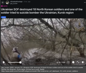 Reddit u/gay_buster Video of Ukrainian Encounter with North Korean Soldier This video portrays a Ukrainian soldier coming across a North Korean soldier in combat. The Ukrainian soldier calls out that the individual is North Korean, but the man also possibly shouts “die” (translation is unclear) in Korean before attempting suicide – an action common in reports of North Korean soldiers, whereas Russians more typically will surrender to be taken prisoner.