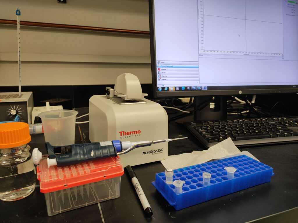 On Thursday, we checked the concentration of our cleaned DNA using a Nanodrop, which uses UV light to measure DNA concentration and purity. The results showed a strong DNA yield, but unfortunately, the PCI cleanup hadn’t removed all the contaminants.