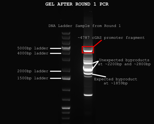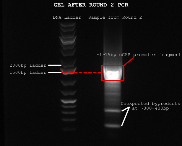 After analyzing our results, we ran Round 2 PCR using the cleaned Round 1 DNA as a template and a second set of primers. Since we were only copying a smaller region, we shortened the extension time. Afterward, we ran another gel to confirm if we got our ~1919bp cGAS promoter—and we did see a band at the right size! However, the band was quite large, and there were also two smaller, unexpected bands around 300–400bp. These might’ve been from non-specific primer binding, which was frustrating, but at least our main product was there.