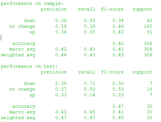 I then tried a different set of features, based on a paper I read which analyzed Twitter posts to predict stock movements. This paper had the most success using tweet volume, so my new set of features had 3 features: total number of words with sentiment, the ratio of positive words to negative words, and ARIMA’s predicted percentage change. Again, I had to create a new data set for these features. Unfortunately, this still didn’t work. At my advisor’s suggestion, I created a cryptocurrency/trading-specific lexicon of positive and negative words. While this improved performance, it still only could predict 2 of the 3 classes.