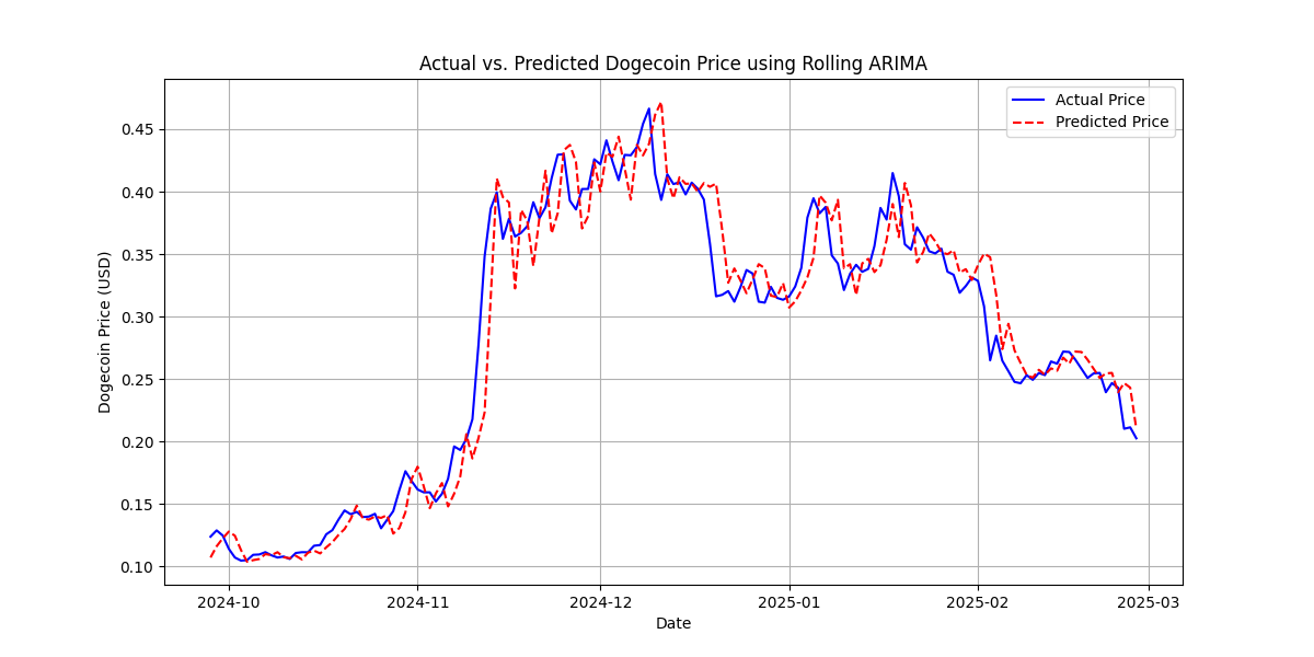 Though it took longer to run, this overcame ARIMA’s inability to deal with sustained price increases, leading to significant accuracy improvements. Mean Absolute Percentage Error decreased from 40.77% to 6.66% for exact forecasting, and up/down forecasting accuracy improved from 47% to 60% (now significantly better than random chance). This method also reduces the amount of training data needed. Below is a chart comparing the model’s predictions to actual prices (generated in Python using matplotlib).