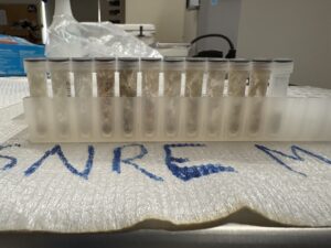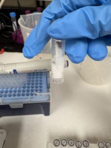 The other project I helped with involved Songbird samples. We extracted the DNA from dried blood samples and I got to use a bead beater machine. We put plastic beads inside the tubes and the machine spun them really fast. We used a different protocol than Qiagen but it was mostly the same. (Pictures at the end).
